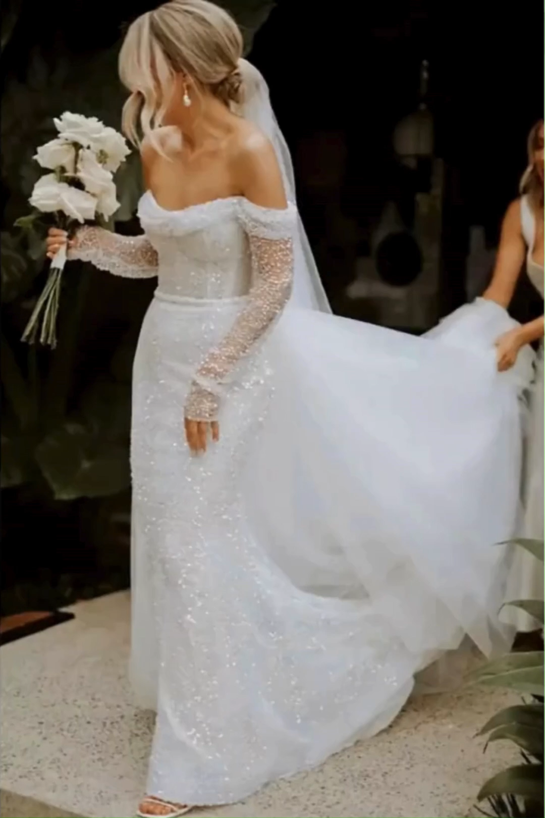 Long Sleeves Sequined Off The Shoulder Mermaid Wedding Dresses With Detachable Train-27dress
